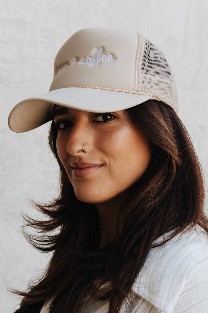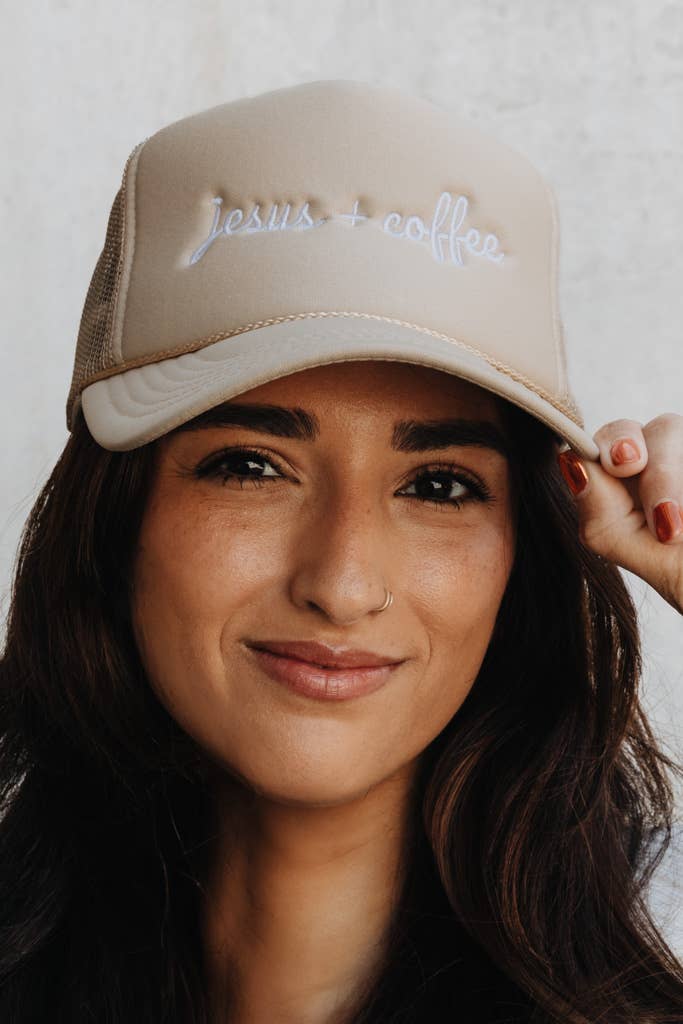 This playful Jesus+Coffee Hat features a classic trucker style with a structured 5-panel design and a 4" foam front for a bold look. The breathable mesh back keeps you cool, while the matching color braid adds a fun touch. A crisp white embroidered design stands out, and the adjustable snapback ensures a comfortable fit for sizes 6 1/2 to 7 5/8. Perfect for the girlies who love their coffee and Jesus!